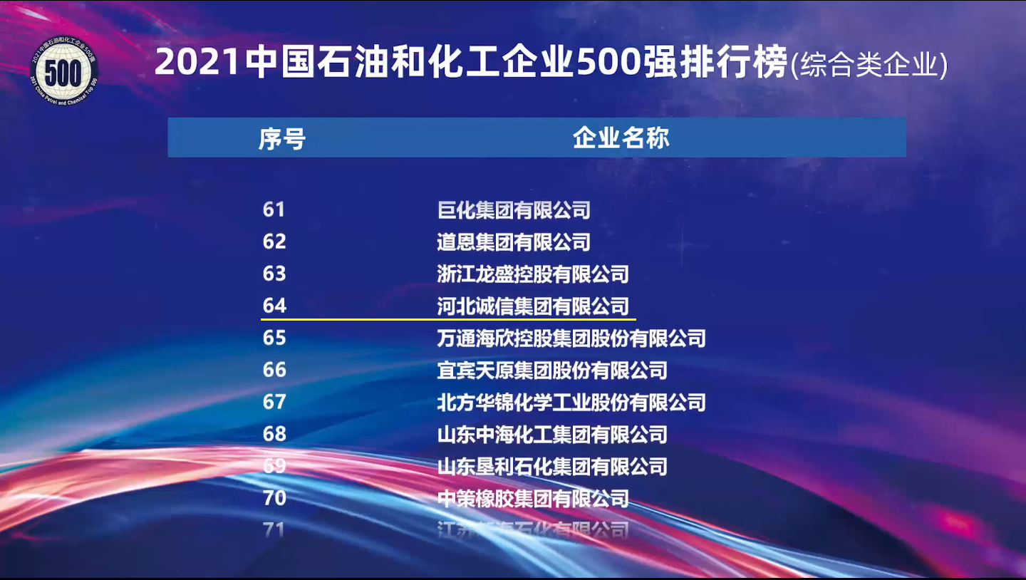 11月29日,2021中国石油和化工企业500强发布会暨双循环新格局下石油化工大企业的机遇与挑战高峰论坛和大连市石化产业推介会网络视频会议在线上召开。会议发布了2021中国石油和化工企业500强排行榜。河北诚信集团凭借稳健的业绩增长和高质量的经营表现,再度荣登500强榜单,位列第64位。这是河北诚信集团连续19年入围该榜单,再次彰显出公司雄厚的综合实力。